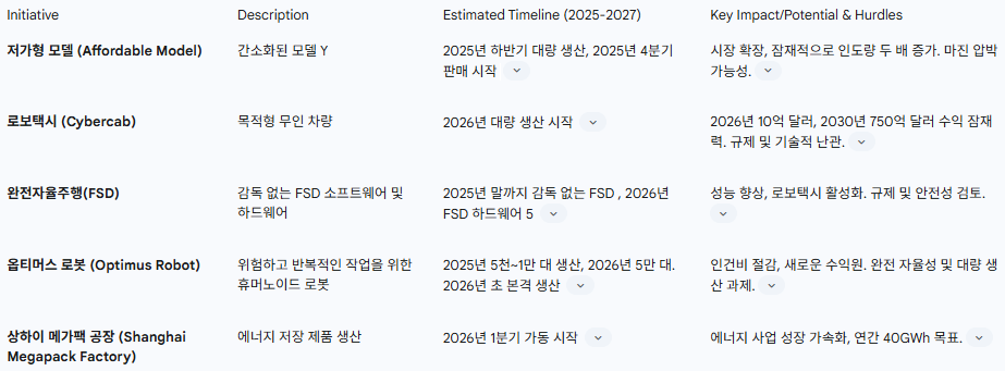 테슬라의 주요 미래 이니셔티브 및 예상 시점 (2025-2027)