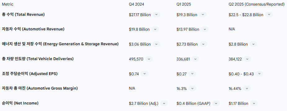 테슬라 주요 재무 성과 요약 (2024-2025)