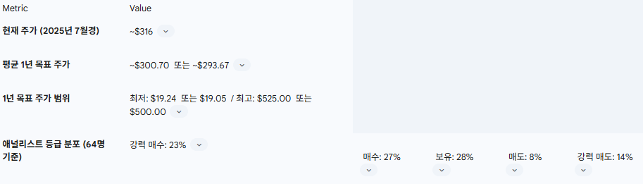 애널리스트들의 의견은 매우 다양합니다. 2025년 7월 기준, 평균 1년 목표 주가는 약 300.70달러이며 , 예측치는 최저 19.24달러에서 최고 525.00달러에 이릅니다. 다른 자료에 따르면 2025년 6월 기준 평균 12개월 목표 주가는 293.67달러로, 현재 주가(약 322달러) 대비 소폭 하락을 시사합니다.