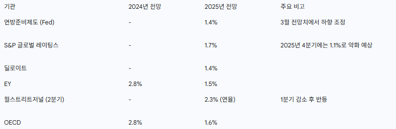 연방준비제도(Fed)는 2025년 6월 발표한 전망에서 2025년 전체 GDP 성장률 전망치를 1.4%로 하향 조정했습니다. 이는 지난 3월의 1.7% 예상치보다 낮아진 것으로, 중앙은행의 더욱 신중한 시각을 반영합니다. 딜로이트 역시 2025년 실질 GDP 성장률을 1.4%로 예상하며, 연준의 수정된 전망과 일치하는 모습을 보입니다. S&P 글로벌 레이팅스는 2025년 실질 GDP 성장률을 1.7%로 다소 높게 전망했지만, 2024년 4분기의 2.5%에서 2025년 4분기에는 1.1%로 성장세가 크게 약화될 것으로 예측했습니다. 이는 하반기로 갈수록 성장세가 둔화될 것임을 시사합니다. EY는 미국 경제 성장률이 2024년 2.8%에서 2025년 1.5%로 둔화될 것으로 내다봤으며 , 모건 스탠리도 전 세계적인 성장 둔화를 예상하면서도 미국은 경기 침체를 피할 것으로 전망했습니다. JP모건 역시 광범위한 성장 둔화를 예측하고 있습니다. Schwab에 따르면 OECD는 미국 GDP가 2024년 2.8%에서 2025년 1.6%로 둔화될 것으로 예상합니다.