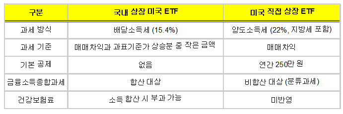 ㆍ 고소득자 (금융소득종합과세 대상자): 미국 직접 상장 ETF가 최적의 선택입니다. 양도소득은 종합과세 대상이 아니므로, 높은 소득세율(최대 45%)을 피할 수 있고, 건강보험료 부담도 발생하지 않습니다.
