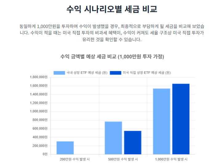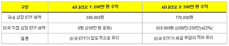 ㆍ소액 투자자 (연 수익금 250만 원 미만): 미국 직접 상장 ETF 투자가 압도적으로 유리합니다. 연간 250만 원까지의 매매차익에 대해 비과세 혜택을 받을 수 있기 때문입니다.