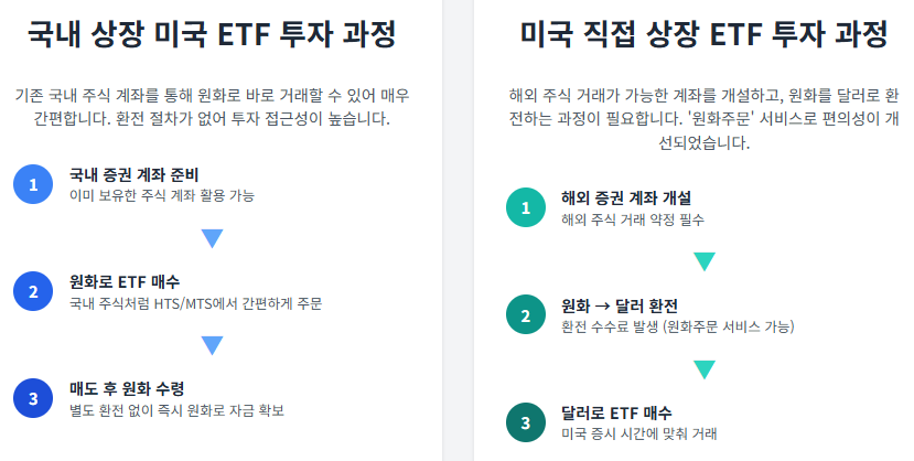 국내 상장 미국 ETF와 미국 직접 상장 ETF는 각각 고유한 장단점을 지닌 상호 보완적인 투자 경로입니다. 두 경로의 핵심적인 차이점을 요약하면 다음과 같습니다.