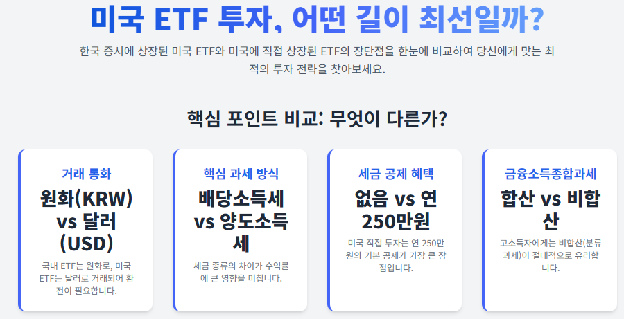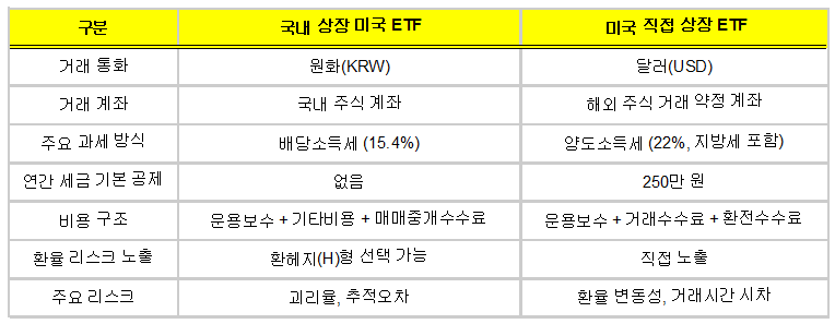 두 투자 방식의 가장 큰 차이점은 세금 구조에 있습니다. 국내 상장 ETF는 배당소득세(15.4%), 미국 직접 상장 ETF는 양도소득세(22%, 연 250만 원 공제)가 적용됩니다. 이 차이는 투자자의 수익 규모와 소득 수준에 따라 큰 영향을 미칩니다.