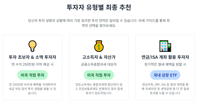 ㆍ 투자 초보자 또는 소액 투자자: 투자 경험이 적거나 소액으로 시작하려는 투자자라면, 국내 상장 ETF를 통해 편리하게 접근하거나, 미국 직접 상장 ETF에 투자하여 연간 250만 원의 비과세 혜택을 누리는 것을 추천합니다.