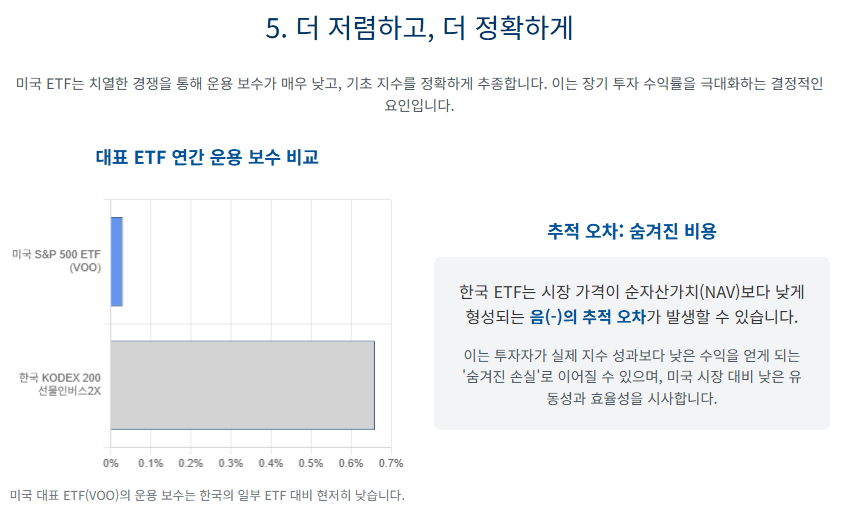 넷째, 낮은 운용 비용과 효율적인 상품 구조를 갖추고 있습니다. 미국 ETF 시장의 치열한 경쟁은 낮은 운용 보수로 이어져 장기 투자 시 발생하는 비용을 최소화하고, 높은 시장 효율성 덕분에 추적 오차로 인한 숨겨진 손실의 위험이 적습니다.