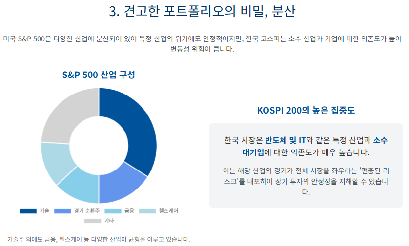 미국과 한국 시장은 지수를 구성하는 산업의 성격과 집중도에서도 뚜렷한 차이를 보입니다. S&P 500 지수는 기술주(34%) 외에도 경기 순환주(16%), 금융, 헬스케어 등 다양한 산업에 걸쳐 대형 기업들로 구성되어 있습니다. 이는 특정 산업의 업황이 부진하더라도 다른 산업에서 이를 상쇄할 수 있는 포트폴리오 분산의 이점을 제공합니다.