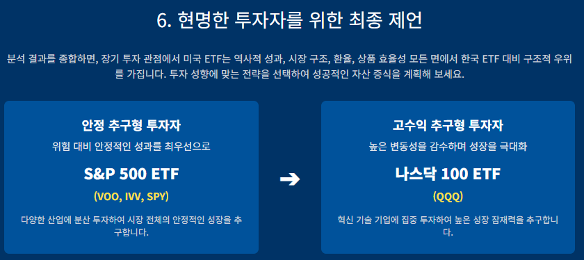 미국 주식 ETF에 대한 장기 투자는 한국 주식 ETF에 대한 장기 투자보다 여러 측면에서 구조적인 이점을 제공하는 것으로 결론지을 수 있습니다.