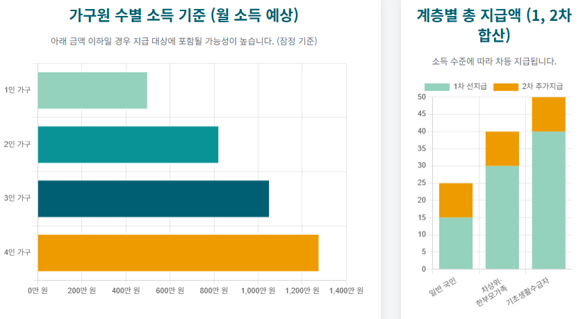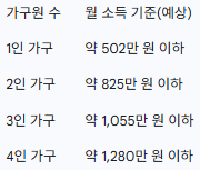 현재까지 알려진 잠정 기준에 따르면, 가구원 수에 따라 월 소득이 아래 표의 기준을 초과할 경우 지급 대상에서 제외될 전망입니다.