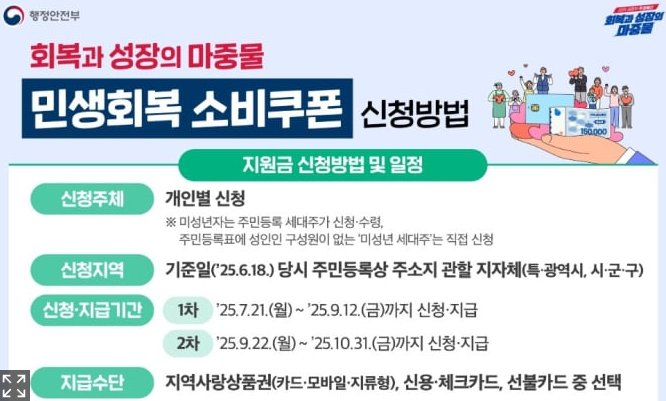 정책 내용에 대한 궁금한 점은 민생회복 소비쿠폰 전담 콜센터(1670-2525)나 정부민원안내 콜센터(110)를 통해 문의하실 수 있습니다. 한편, 정부와 금융기관은 URL이나 링크가 포함된 문자 메시지를 보내지 않으므로, 이러한 메시지는 스미싱 사기일 가능성이 높습니다.