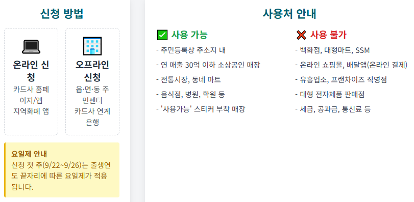 사용 가능한 매장은 지역 경제 활성화라는 정책 취지에 따라 연 매출 30억 원 이하의 소상공인 매장으로 한정됩니다. 여기에는 전통시장, 동네 마트, 음식점, 병원, 학원 등 대부분의 골목상권이 포함됩니다.