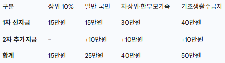 이번 지원금은 소득 수준에 따라 차등적으로 지급되는 것이 가장 큰 특징입니다. 전체 지급은 1차와 2차에 걸쳐 이루어지며, 각 지급 단계와 계층별 금액은 아래 표와 같습니다.