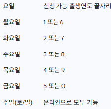 시스템 과부하를 방지하기 위해 1차 지급 신청 첫 주(7월 21일 ~ 7월 25일)에는 출생연도 끝자리에 따른 요일제가 적용되었습니다. 2차 지급 신청 첫 주(9월 22일부터)에도 마찬가지로 동일한 요일제가 운영될 예정이므로, 아래 표를 참고하여 신청해 주시기 바랍니다.