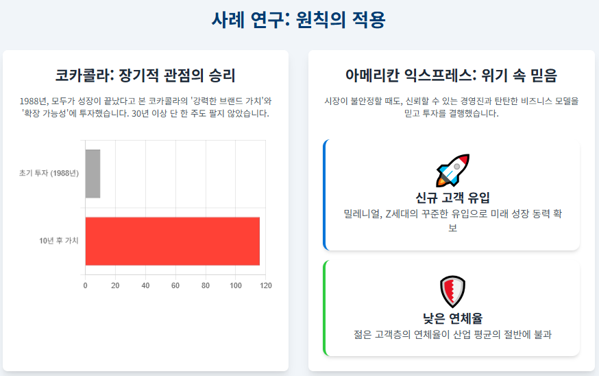 워런 버핏의 코카콜라 투자는 그의 장기 투자 철학을 가장 잘 보여주는 사례입니다. 1988년 당시 많은 투자자들은 코카콜라를 성장이 끝난 회사로 여겼습니다. 하지만 그는 이 회사를 전 세계 어디서나 사랑받는 '최고의 투자 대상'이자 강력한 '프랜차이즈'로 평가했습니다. 그는 콜라를 하루 다섯 잔 마실 정도로 코카콜라의 강력한 브랜드 가치와 전 세계 시장 확장 가능성을 꿰뚫어 보았으며, 주가가 합리적인 수준으로 떨어지자 약 10억 달러라는 거금을 투자했습니다. 이후 30년이 넘는 기간 동안 단 한 주도 팔지 않고 지분을 유지함으로써 , 그의 10억 달러는 10년 만에 약 116억 달러의 가치로 성장했습니다. 이 사례는 단기적 시장 소음에 흔들리지 않고 기업의 본질적 가치에 투자하며, 시간을 아군으로 만드는 그의 통찰이 얼마나 큰 보상으로 돌아오는지를 극명하게 입증합니다.