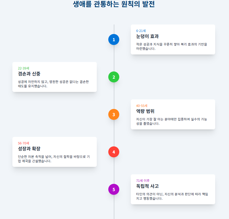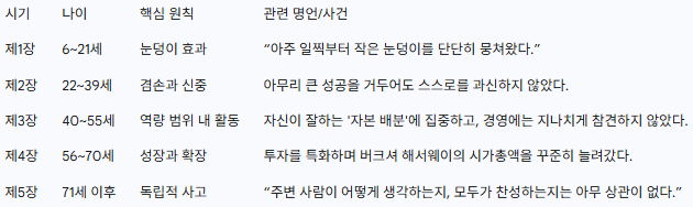 아래 표는 워런 버핏의 생애를 다섯 시기로 나누어 각 시기에 형성된 핵심 원칙을 한눈에 보여줍니다.