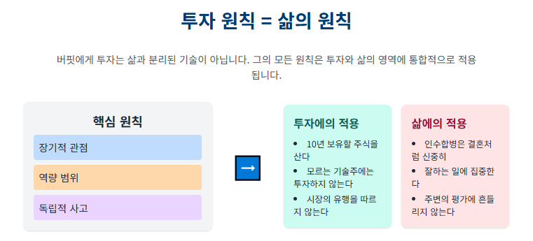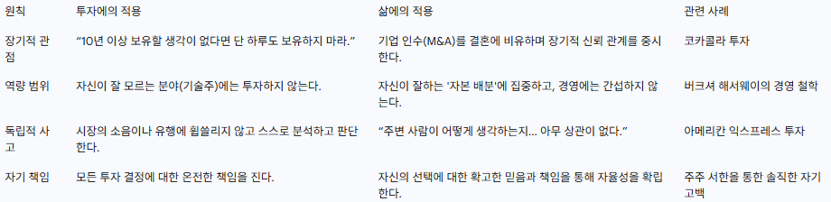 아래 표는 워런 버핏의 핵심 원칙들이 투자와 삶의 영역에 어떻게 통합적으로 적용되는지를 보여줍니다.