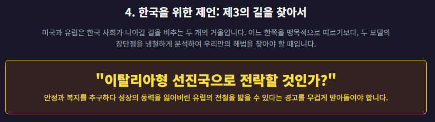 이 책은 한국이 이미 유럽이 겪고 있는 여러 문제점(고령화, 저성장, 복지 부담)을 공유하고 있으며, 자칫하면 활력을 잃어가는 '이탈리아형 선진국'으로 전락할 수 있다는 경고를 던집니다. 이는 안정과 복지라는 매력적인 가치를 추구하다가 결국 경제적 동력을 상실한 유럽의 전철을 밟을 위험이 있음을 의미합니다.