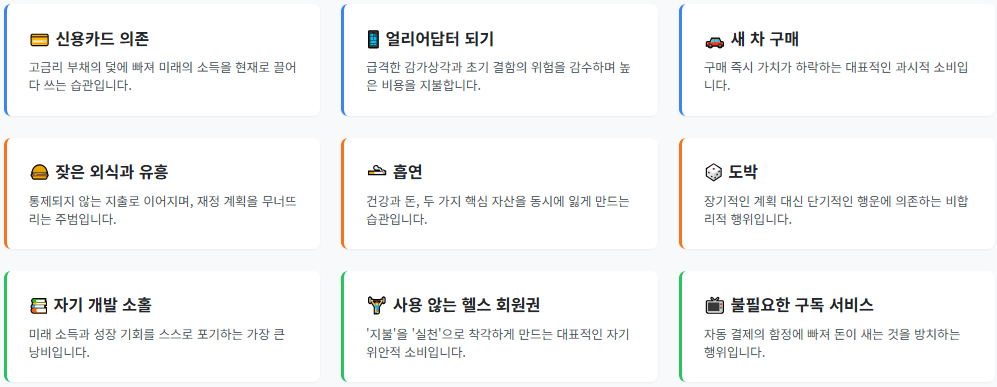 소비 패턴 추적 및 예산 관리: 불필요한 지출을 줄이기 위해 예산 관리 앱을 활용하고 , 구매 전 "이것이 정말 필요한가?"라고 자문하며 '필요'와 '원하는 것'을 명확히 구분하는 습관을 들여야 합니다.