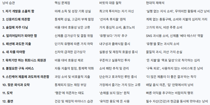 다음은 워런 버핏의 관점에서 가난한 사람들이 자주 범하는 12가지 돈 낭비 습관을 그의 핵심 철학과 연결하여 분석한 내용입니다.