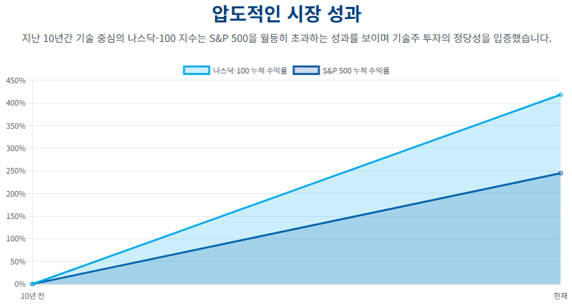 미국 기술주 투자의 정당성은 견고한 기업 펀더멘털을 넘어, 장기적인 시장 성과 데이터에 의해 명확히 입증되어 왔습니다. 기술 중심의 나스닥-100(NASDAQ-100) 지수는 지난 수십 년간 광범위한 시장 지수인 S&P 500을 지속적으로 능가해 왔습니다.