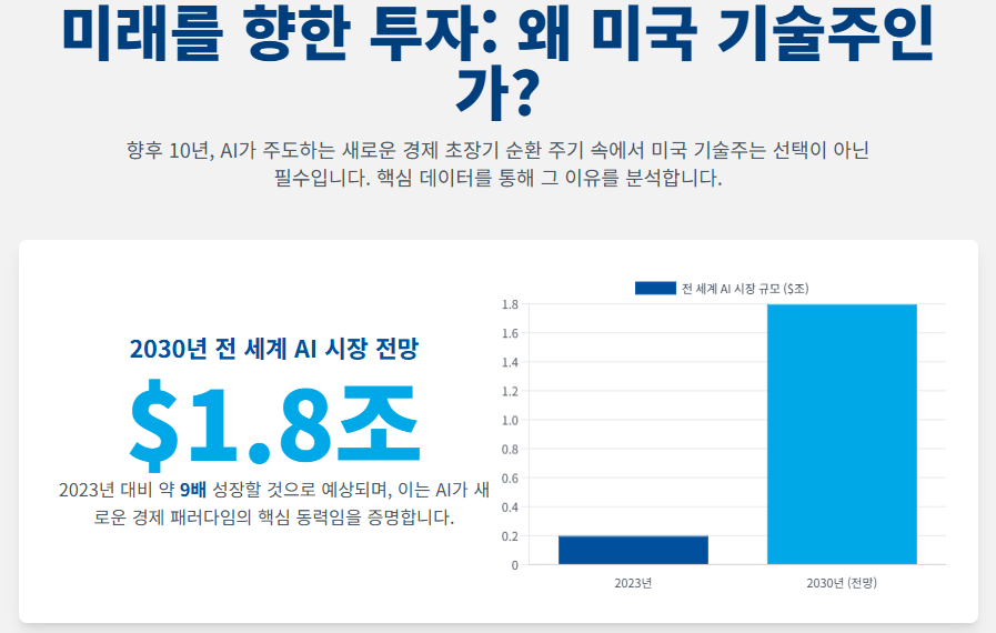 미국 기술주 투자를 논할 때 가장 먼저 이해해야 할 핵심은 인공지능(AI)이 일시적인 유행을 넘어 새로운 경제 초장기 순환 주기의 근본적인 촉매제가 되고 있다는 점입니다. AI는 단순한 기술 혁신이 아니라 전 산업 분야에 걸쳐 생산성 향상과 비즈니스 모델의 재편을 가져오는 광범위한 변혁의 힘으로 작용하고 있습니다.