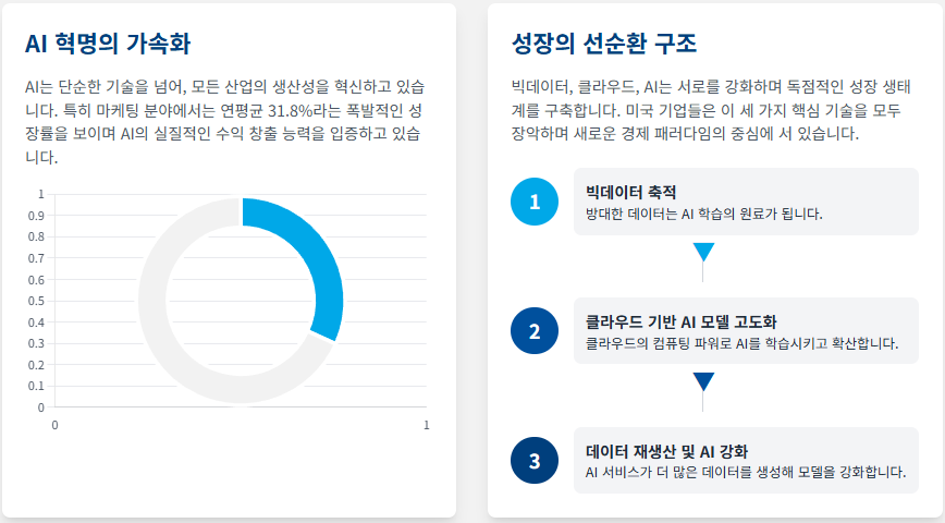 AI 혁명의 확장은 클라우드 컴퓨팅 및 빅데이터 인프라 없이는 불가능합니다. 이들은 AI의 폭발적인 성장을 가능하게 하는 필수적인 토대이자, 서로를 강화하는 핵심 요소로 기능하고 있습니다. 미국 기업들은 이 세 가지 기술의 상호 의존적인 생태계를 장악하고 있으며, 이는 미국 기술주 투자에 대한 강력한 근거가 됩니다.