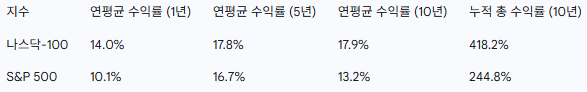 아래 표에서 확인할 수 있듯이, 나스닥-100은 지난 10년간 **418.2%**라는 경이로운 누적 수익률을 기록하며 S&P 500의 **244.8%**를 압도했습니다. 이는 기술주가 단순한 투기 대상이 아닌, 장기적인 관점에서 포트폴리오의 수익률을 견인하는 핵심 동력이었음을 보여줍니다.