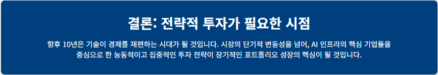 미국 기술주 투자는 향후 10년간의 투자 포트폴리오에 필수불가결한 요소로 분석됩니다. 새로운 경제 초장기 순환 주기의 도래, 이를 주도하는 독보적인 미국 혁신 생태계, 그리고 거시경제적·지정학적 리스크를 관리하며 성장을 지속할 수 있는 소수 기술 거인들의 존재는 이러한 결론에 대한 강력한 근거를 제공하고 있습니다.