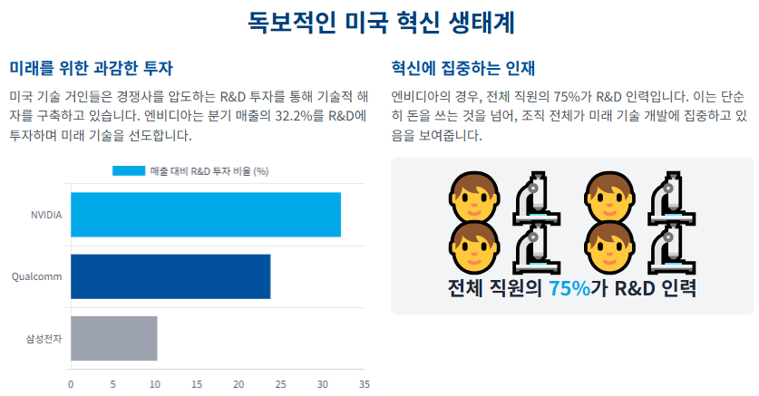 이들 기업의 압도적인 R&D 투자는 기술적 리더십을 유지하기 위한 핵심 전략입니다. 엔비디아는 분기 매출의 **32.2%**에 달하는 금액을 R&D에 투자하며, 이는 삼성전자(10.3%)나 퀄컴(23.8%)과 같은 경쟁사들을 압도하는 수준입니다. 엔비디아의 전체 직원의 **75%**가 R&D 인력이라는 점은 미래 기술 개발에 대한 이들의 비타협적인 집중을 단적으로 보여줍니다.
