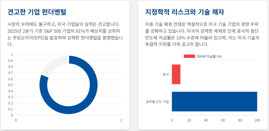 물론, 기술 거품에 대한 우려, 지정학적 긴장, 그리고 규제 강화와 같은 위험 요소들이 존재합니다. 그러나 심층 분석 결과, 현재의 기술 혁신은 과거 닷컴 버블과 달리 구체적인 경제적 이익과 견고한 비즈니스 모델을 기반으로 하고 있으며, 지정학적 리스크는 오히려 미국 기술 기업들의 경쟁적 해자(Moat)를 강화하는 요인으로 작용하고 있습니다.
