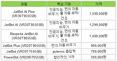 6. 2024년 삼성 로봇 청소기의 모델 별 가격 비교 :